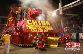 中国华为巴西公司赞助了此次中国主题的桑巴表演,驻巴西使馆文化处对花车、队伍编排、服装及音乐的创意进行了支持与指导,并提供了部分道具。(刘英)