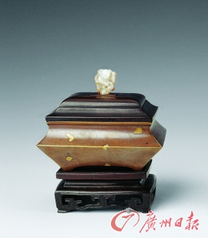 宽12.8cm,铜炉形制特殊,四方折肩形,铸造规整。炉身洒饰金片,华丽富贵,古朴典雅。木制炉盖,盖上嵌白玉童子为钮,雕工细腻。底落“大明宣德年制”款,配有原木座。
