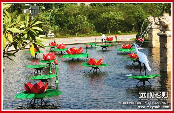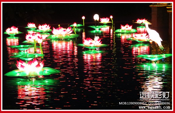 据悉,广东惠州雅居乐地产为了给小区居民创造良好的节日氛围,首次引进仿真荷花技术,并邀请自贡远视传媒对湖面景观进行专题设计,采用闻名世界的自贡彩灯技术将湖面景观打造得流光溢彩,表现得淋淋尽致,湖中有争相盛开的荷花,有含苞欲放的荷花骨朵,还有站在荷叶上准备下水的白鹭,还有呱呱叫的青蛙,好一派和谐生态田园之景象。